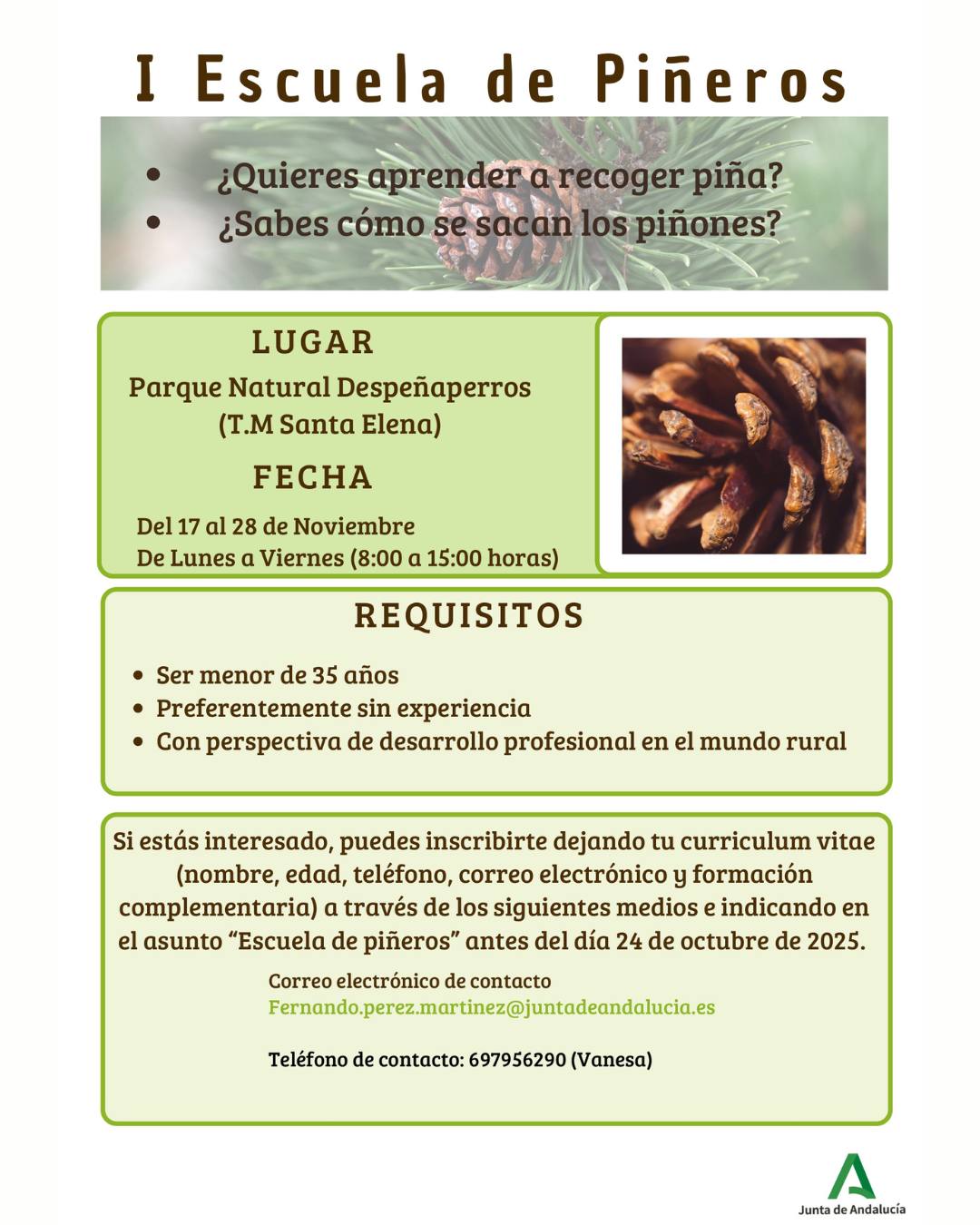 La actividad se desarrollará en el Parque Natural Despeñaperros, dentro del término municipal de Santa Elena, el curso se celebrará del 17 al 28 de noviembre, de lunes a viernes, en horario de 8:00 a 15:00 horas.
