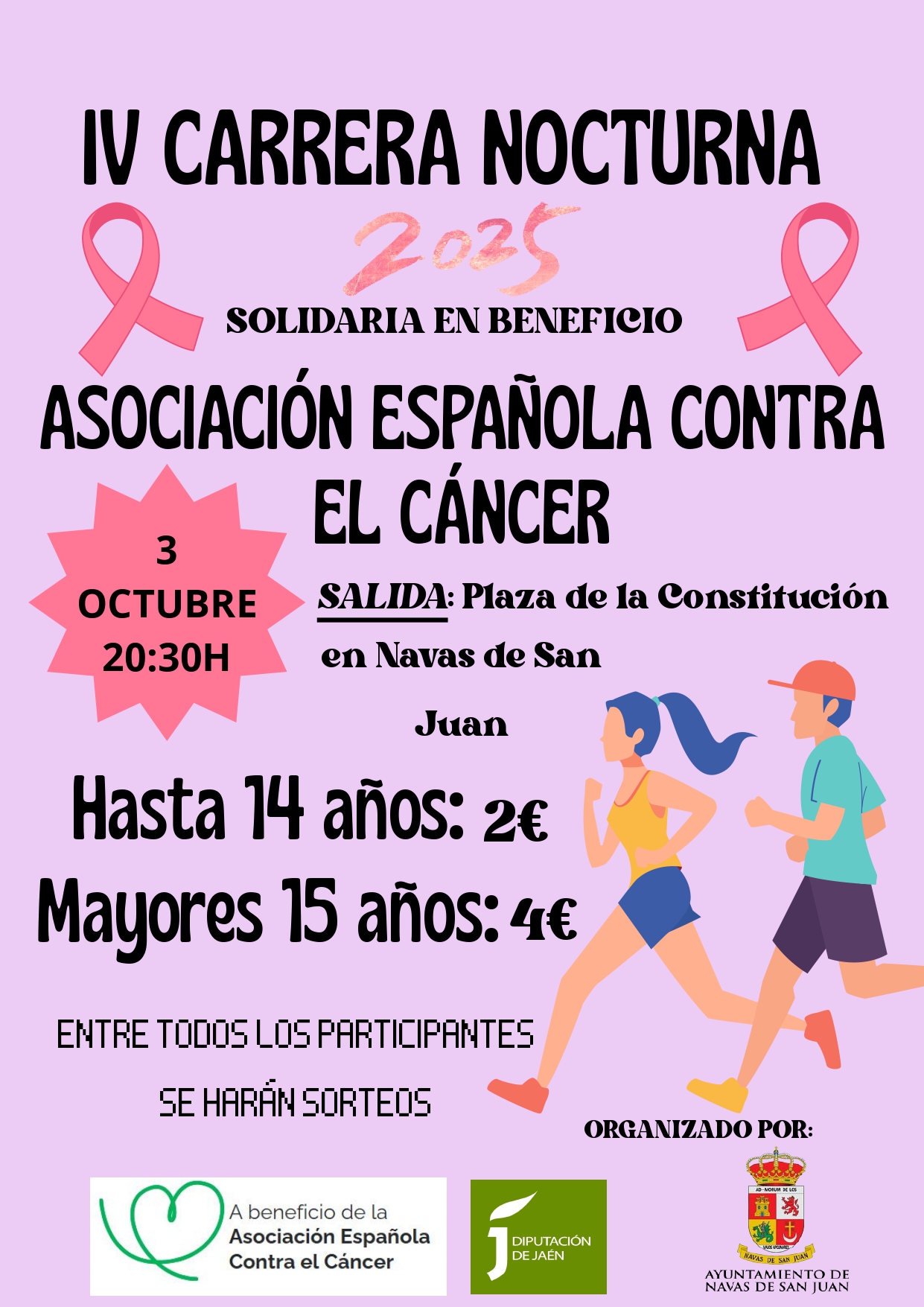 El próximo 3 de octubre de 2025, Navas de San Juan acogerá la IV Carrera Nocturna Solidaria, un evento deportivo con fines benéficos en apoyo a la Asociación Española Contra el Cáncer (AECC). La cita dará comienzo a las 20:30 horas con salida desde la Plaza de la Constitución.