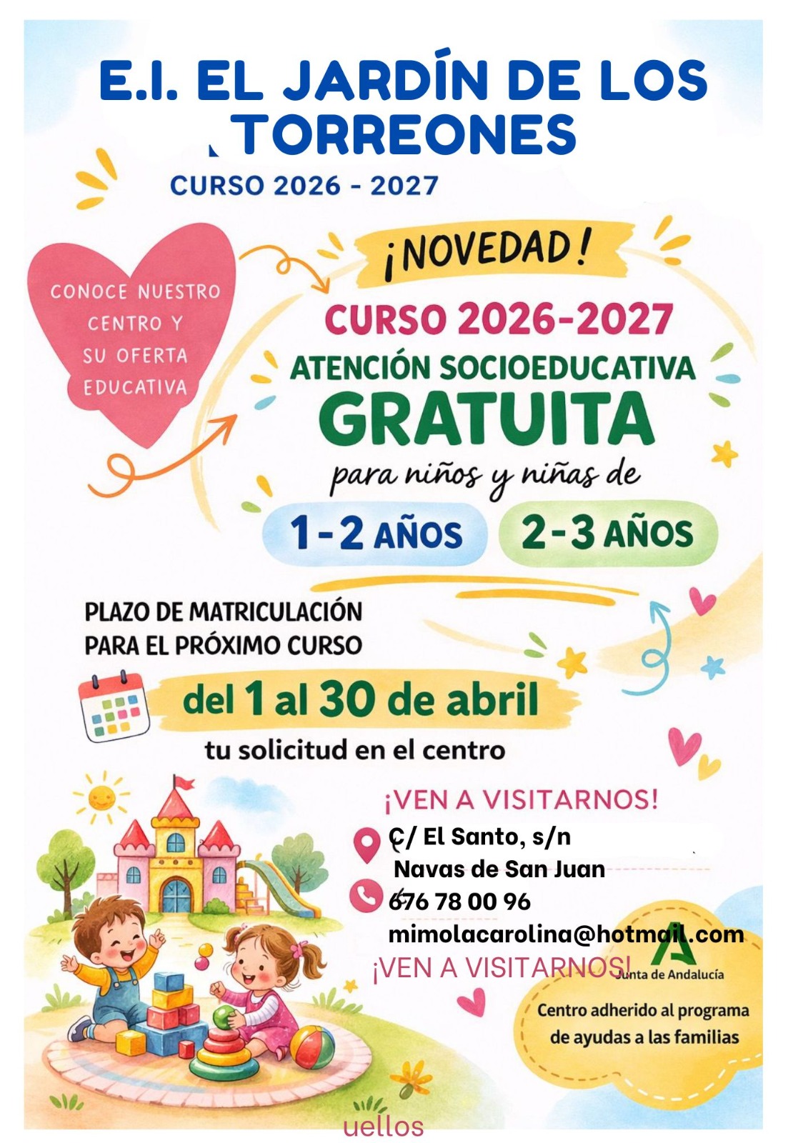 El Centro Educativo 'El Jardín de los Torreones' de Navas de San Juan abre el plazo de matriculación para el curso 2026-2027. Para este curso, el centro ofrece atención socioeducativa gratuita destinada a niños y niñas de entre 1 a 2 años y 2 a 3 años.
