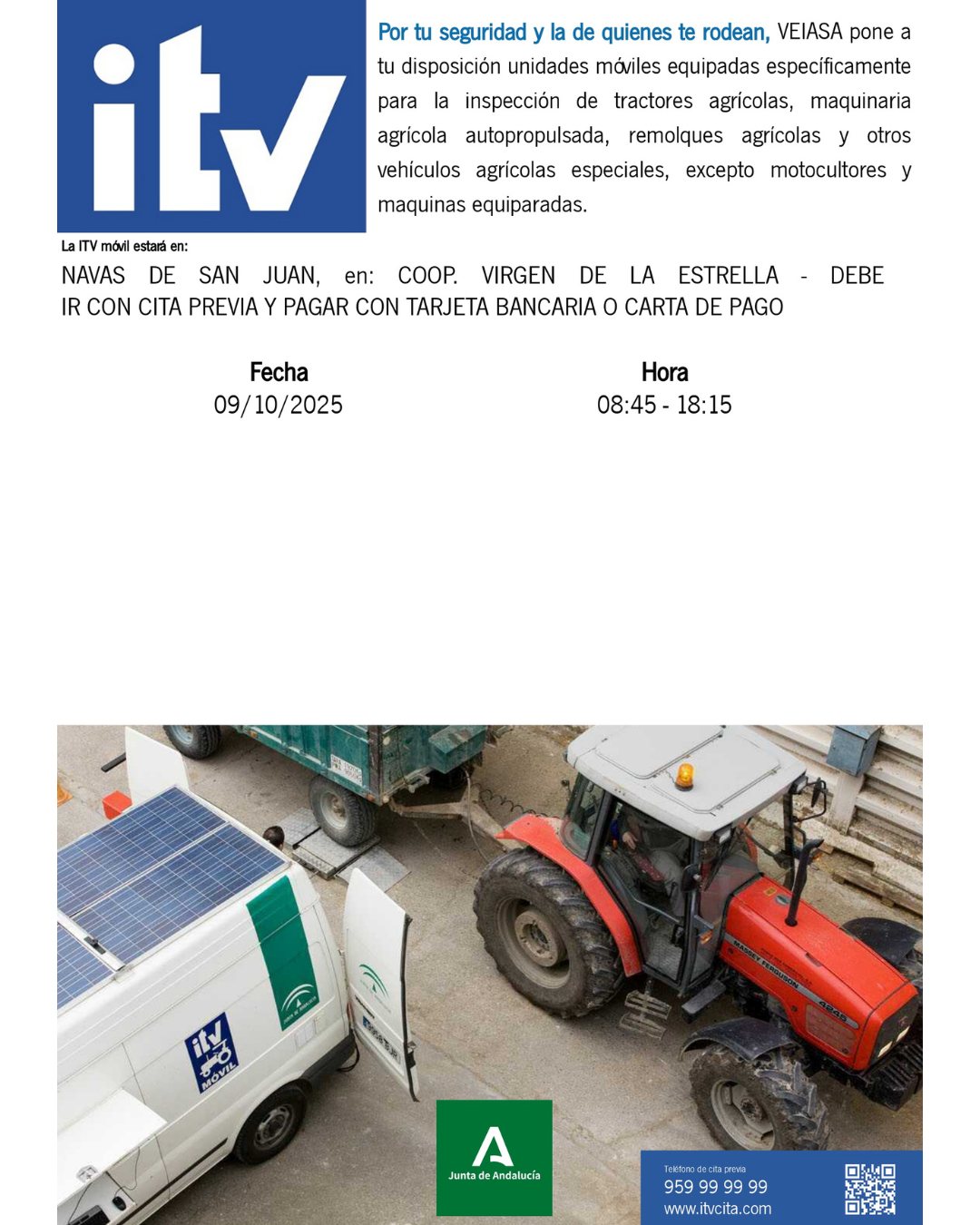 Las unidades móviles equipadas específicamente para la inspección de tractores agrícolas, maquinaria agrícola autopropulsada, remolques agrícolas y otros vehículos agrícolas especiales, excepto motocultores y máquinas equiparadas de VEIASA, estarán disponible próximamente en la cooperativa ‘Virgen de la Estrella’ en Navas de San Juan.