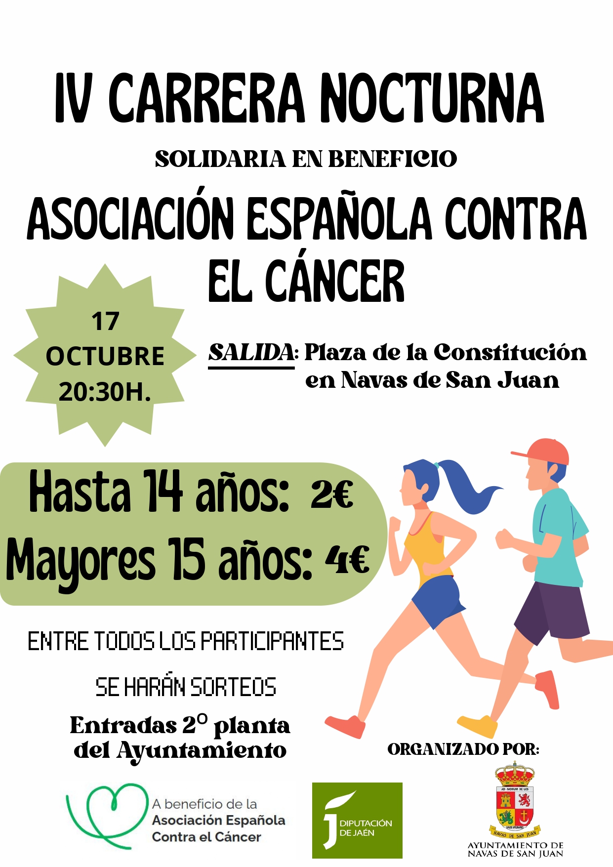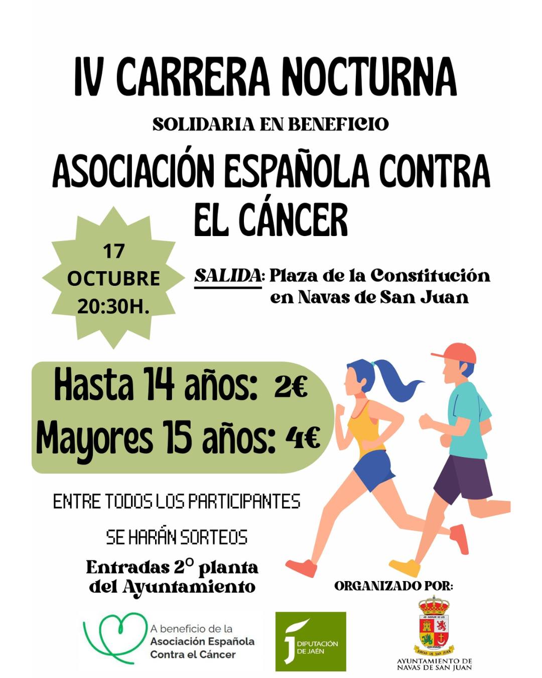 Navas de San Juan celebra la IV Carrera Nocturna Solidaria el viernes 17 de octubre a las 20:30 horas, un evento deportivo organizado en beneficio de la Asociación Española Contra el Cáncer (AECC).