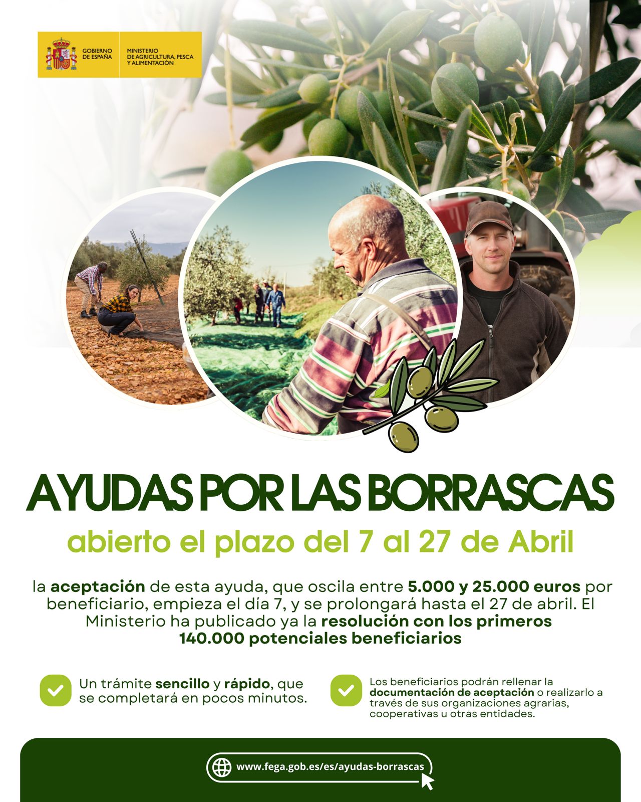 ➡️ Desde hoy, martes 7 de abril, y hasta el próximo 27 de abril, ha quedado abierto el plazo para la tramitación de la aceptación de las ayudas del Gobierno de España para paliar los daños sufridos en las explotaciones agrarias como consecuencia del pasado tren de borrascas.