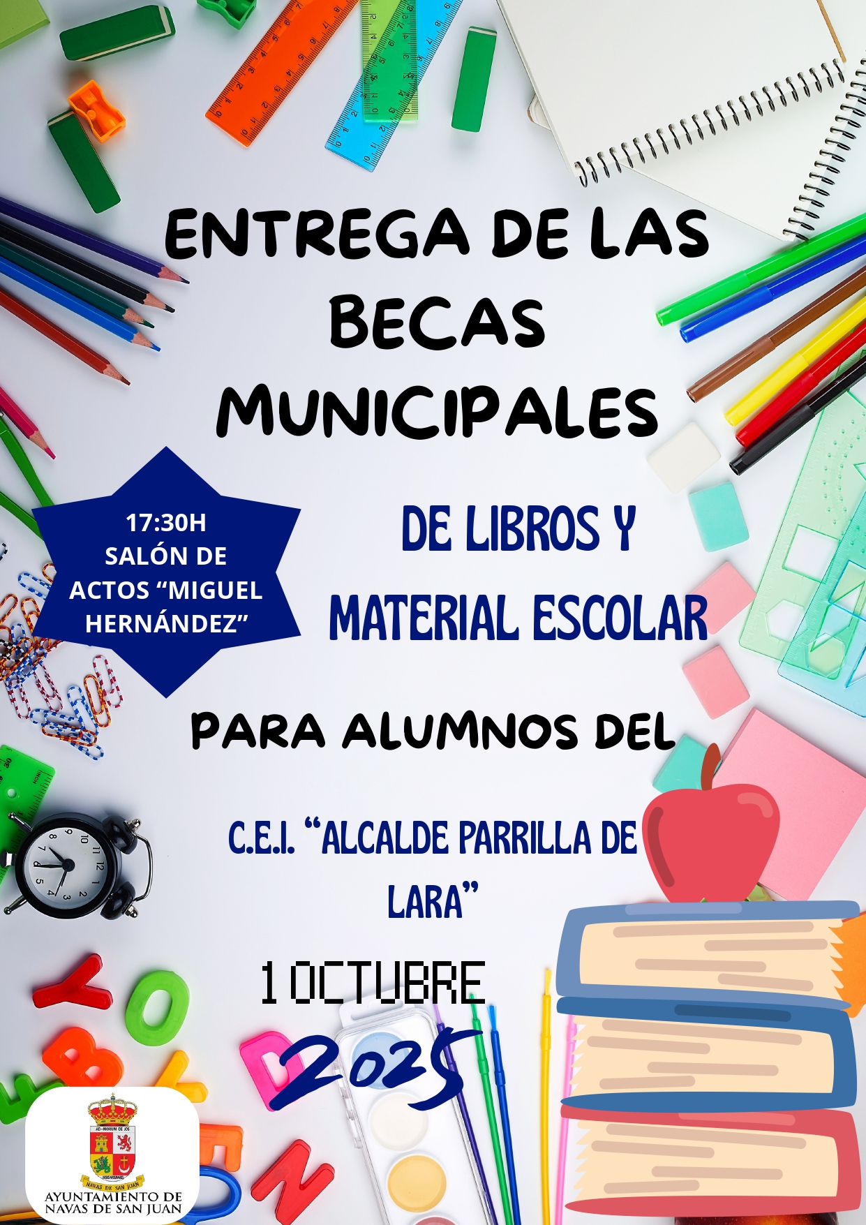 El Ayuntamiento de Navas de San Juan convoca a los alumnos del C.E.I. ‘Alcalde Parrilla de Lara’ a la entrega de las becas municipales de libros y material escolar. Se celebrará el 1 de octubre a las 17:30 horas en el Salón de Actos ‘Miguel Hernández’.