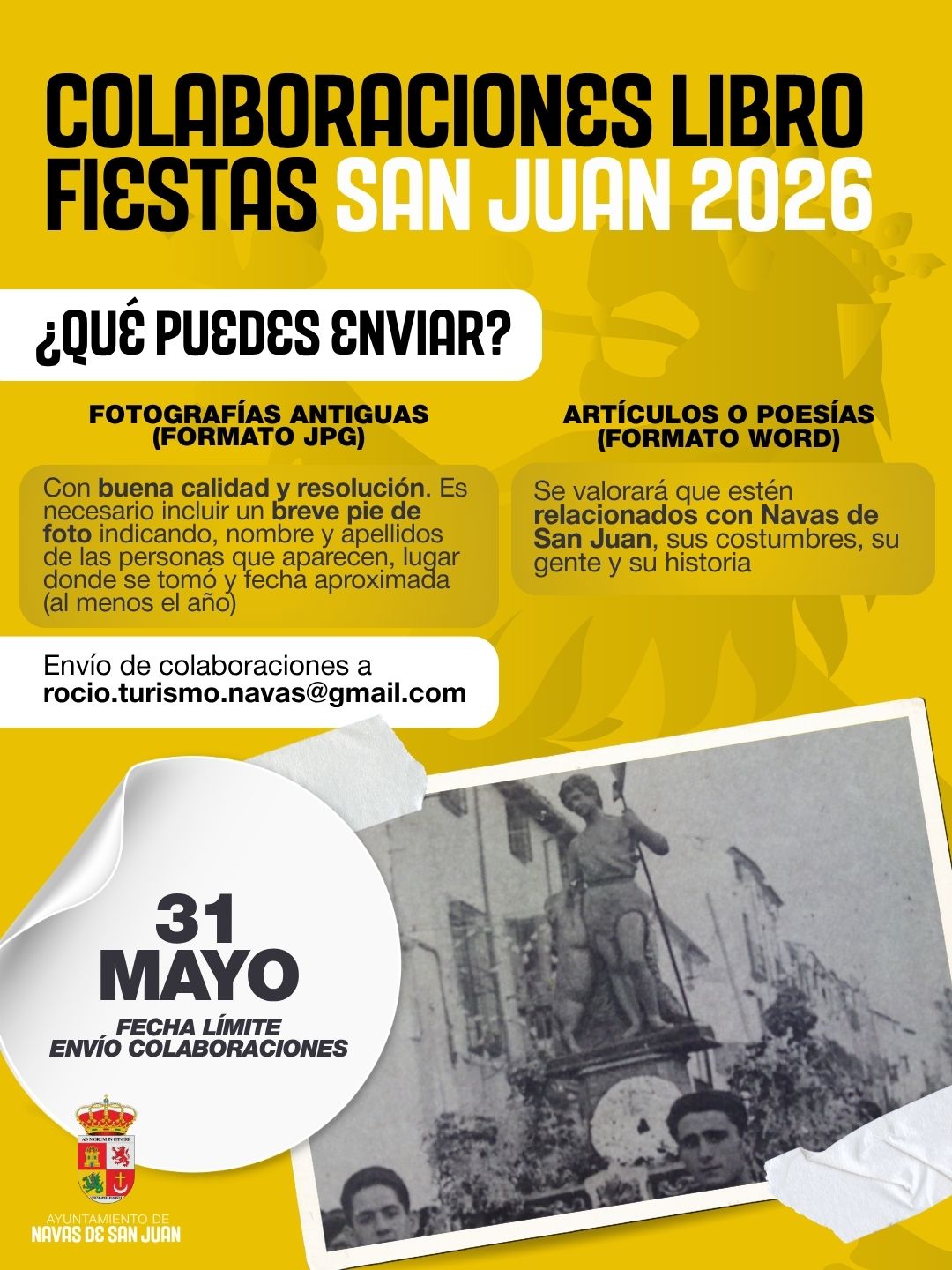 Desde el Ayuntamiento de Navas de San Juan invitamos a toda la ciudadanía a participar en la próxima edición del Libro de las Fiestas de San Juan 2026 hasta el 31 de mayo.