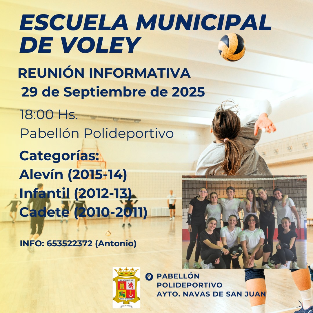 La Escuela Municipal de Vóley, tiene previstas sus clases en horario de 18:00 horas, en el Pabellón Polideportivo Municipal. Va por categorías según el año de nacimiento de los participantes: