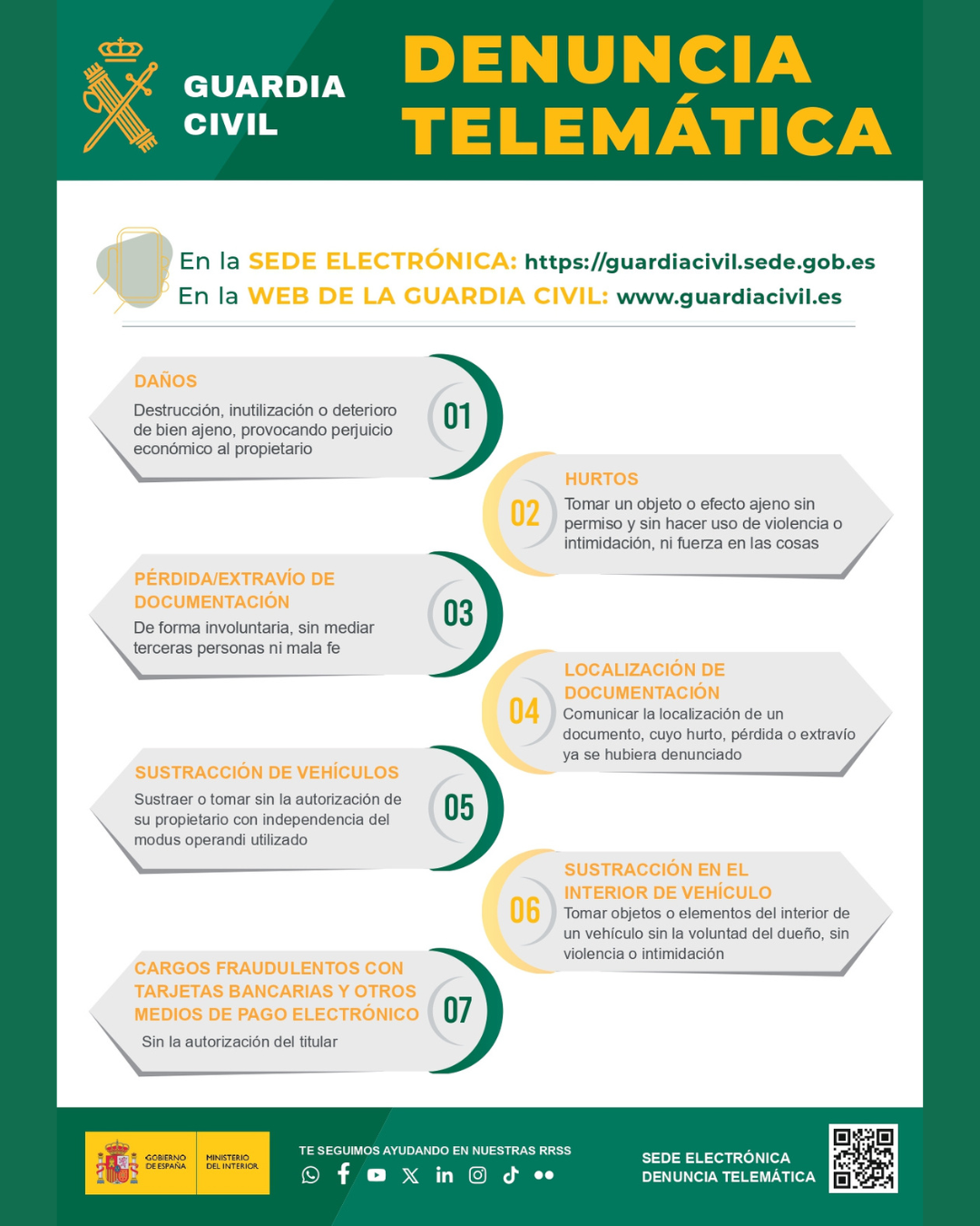 Una de las más destacadas es la Denuncia Telemática con firma electrónica, que se puede hacer directamente a través de la Sede Electrónica de la Guardia Civil.