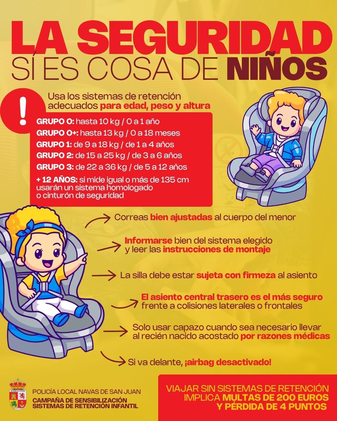 La Policía Local de Navas de San Juan informa a los padres y madres sobre los riesgos que corren los niños menores de 14 años al no utilizar sistemas de seguridad adecuados, como los cinturones de seguridad o las sillas infantiles homologadas.