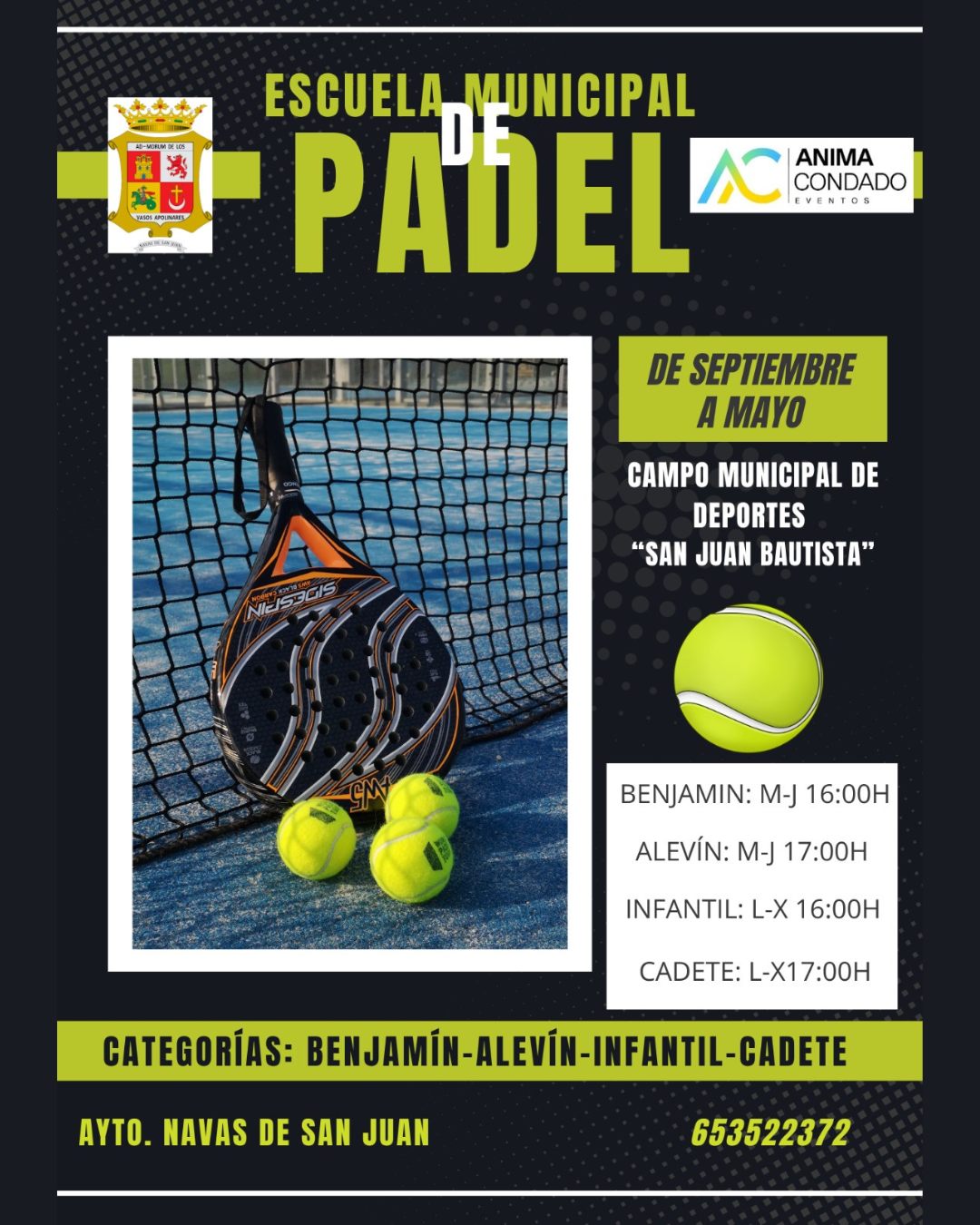 La Escuela Municipal de Pádel se imparte en el Campo Municipal de Deportes 'San Juan Bautista'. Está abierta a cuatro categorías:
