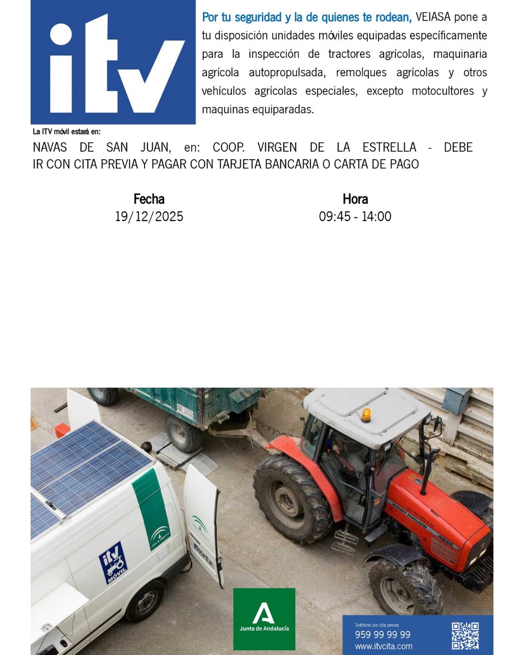 Las unidades móviles equipadas específicamente para la inspección de tractores agrícolas, maquinaria agrícola autopropulsada, remolques agrícolas y otros vehículos agrícolas especiales, excepto motocultores y máquinas equiparadas de VEIASA, estarán disponibles en la cooperativa ‘Virgen de la Estrella’ en Navas de San Juan.