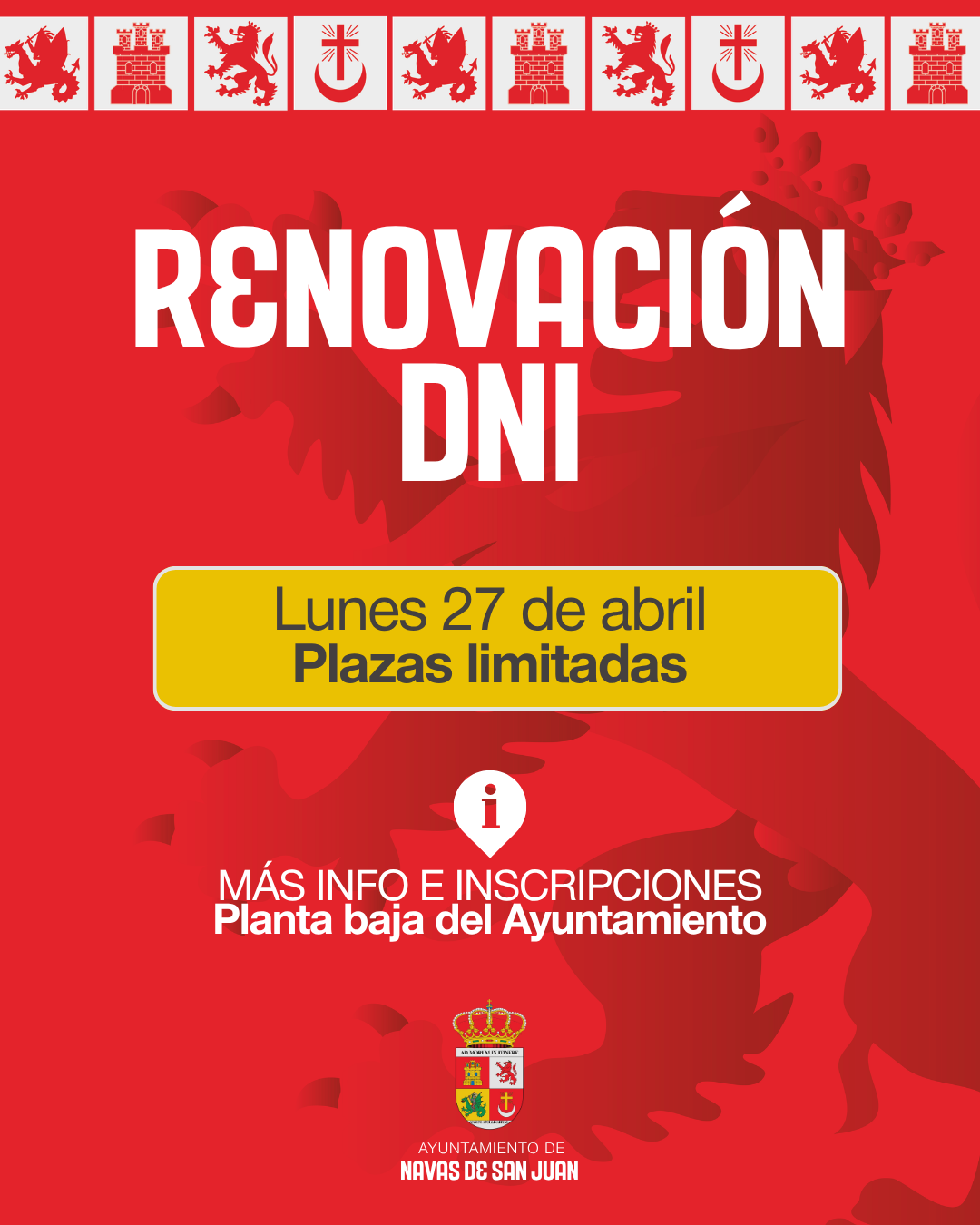 El próximo lunes 27 de abril , un equipo móvil de la Policía se desplazará al Ayuntamiento de Navas de San Juan para facilitar la renovación del DNI a todas las personas que lo necesiten.