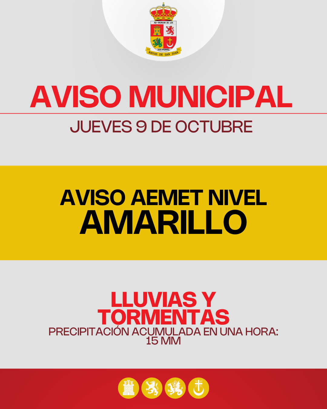 La 𝐀𝐄𝐌𝐄𝐓 anuncia 𝐚𝐯𝐢𝐬𝐨 𝐚𝐦𝐚𝐫𝐢𝐥𝐥𝐨 𝐩𝐨𝐫 lluvias y tormentas en la comarca de El Condado para hoy jueves 9 de octubre desde las 11:00 horas hasta las 23:59 horas.