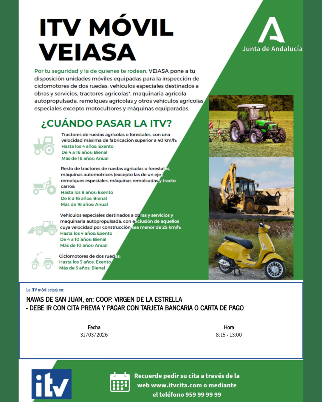ITV móvil vehículos agrícolas2026-03-27 15:05:09Info GeneralLas unidades móviles equipadas específicamente para la inspección de ciclomotores de dos ruedas, vehículos especiales destinados a obras y servicios, tractores agrícolas, maquinaria agrícola autopropulsada, remolques agrícolas y otros vehículos agrícolas especiales, excepto motocultores y máquinas equiparadas de VEIASA, estarán disponibles en la cooperativa ‘Virgen de la Estrella’ en Navas de San Juan.